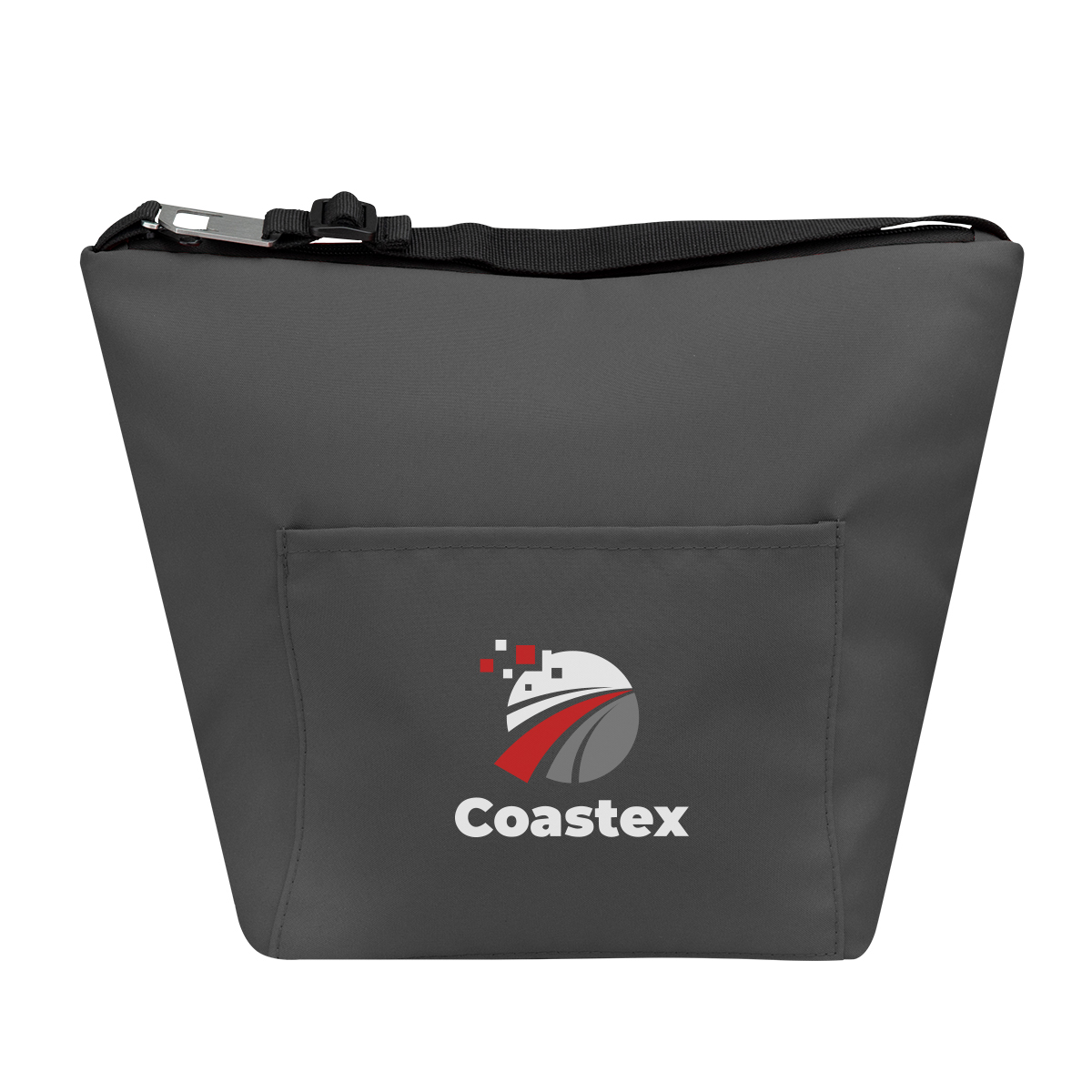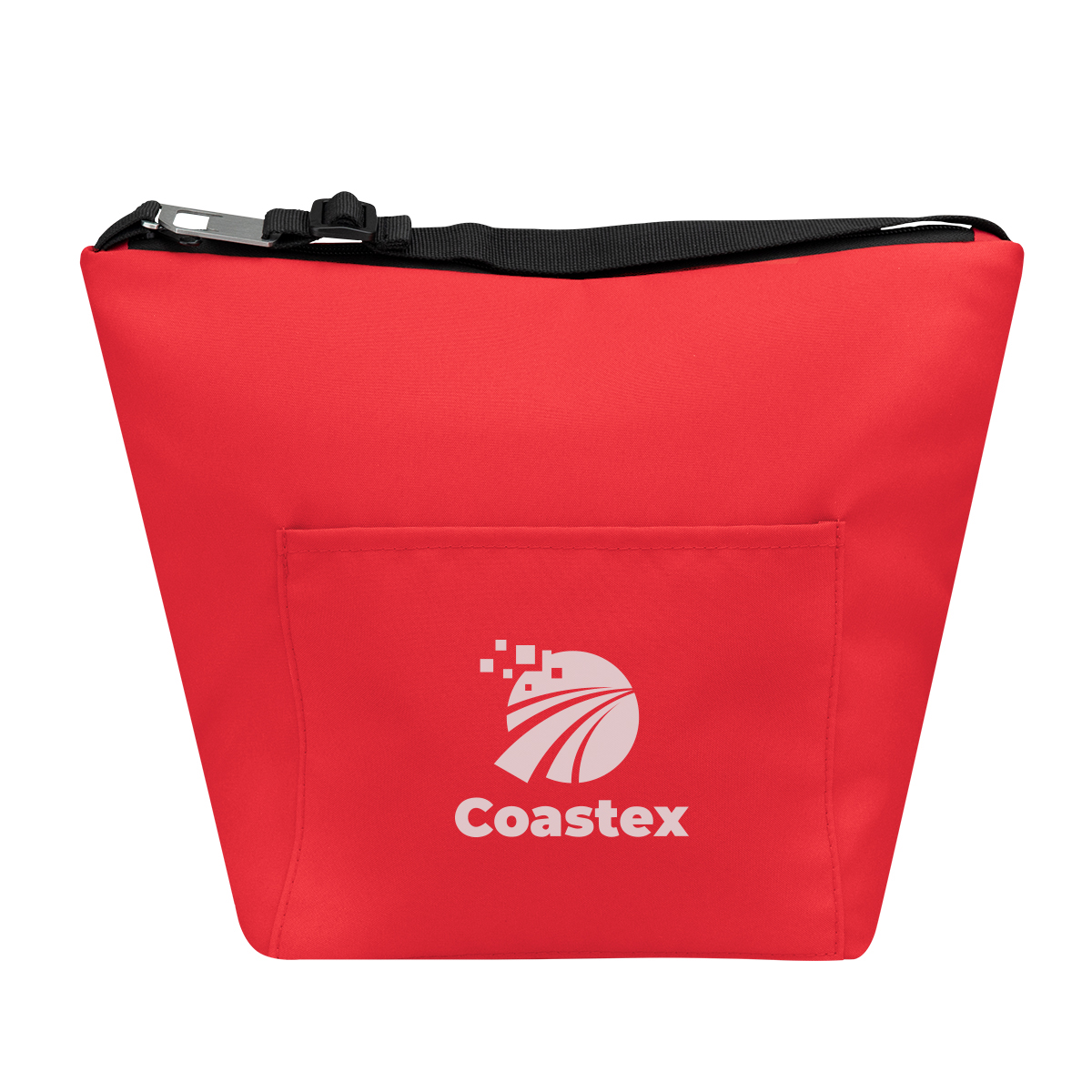 Zippered main compartment and front slip pocket offer secure storage for drinks and small essentials