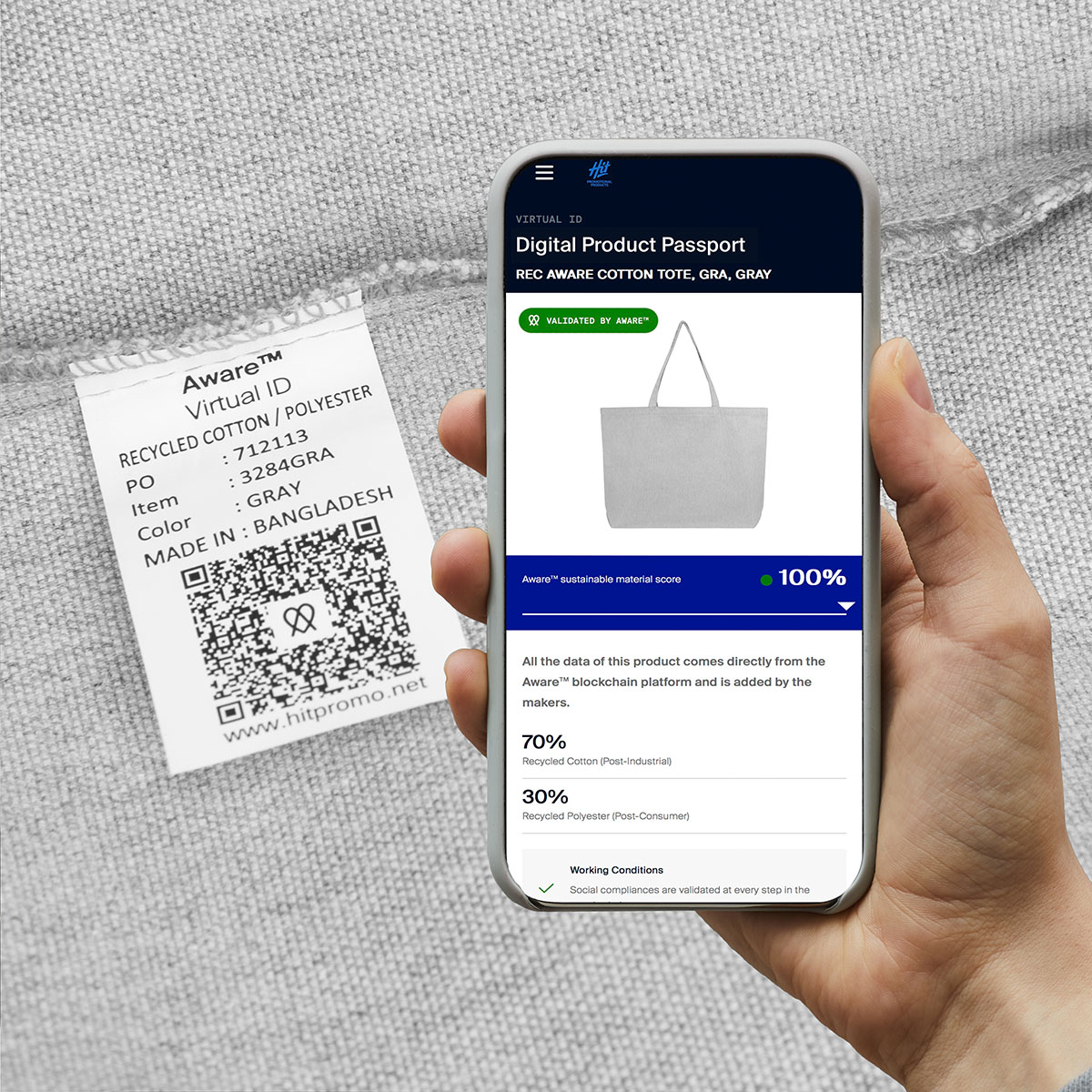 Aware™ technology offers verified traceability, allowing users to scan the integrated QR code for product details and sustainability credentials