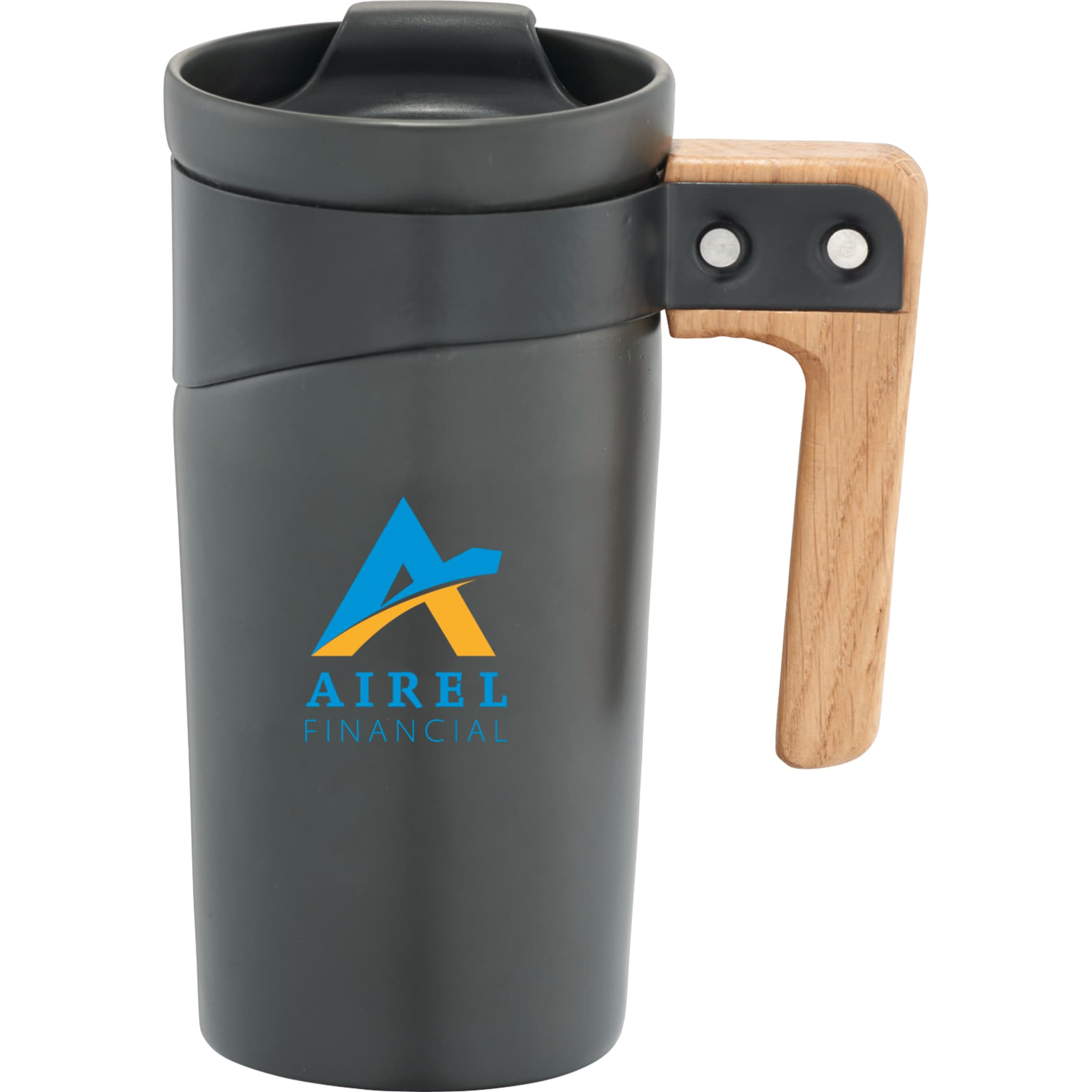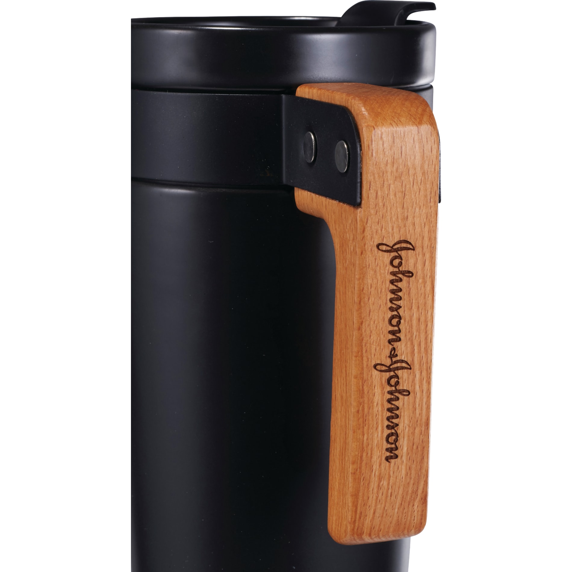 16 oz ceramic tumbler features a matte finish and a unique natural wooden handle for a comfortable grip