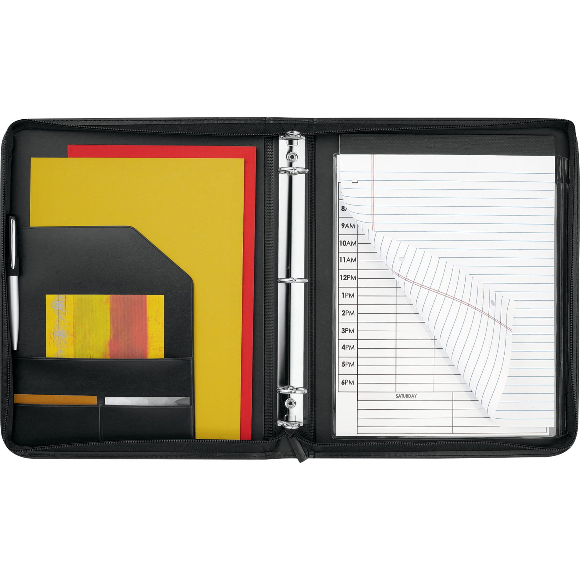 Keeps your meeting essentials organized with a secure zippered closure, integrated pen loop, and interior organizer section