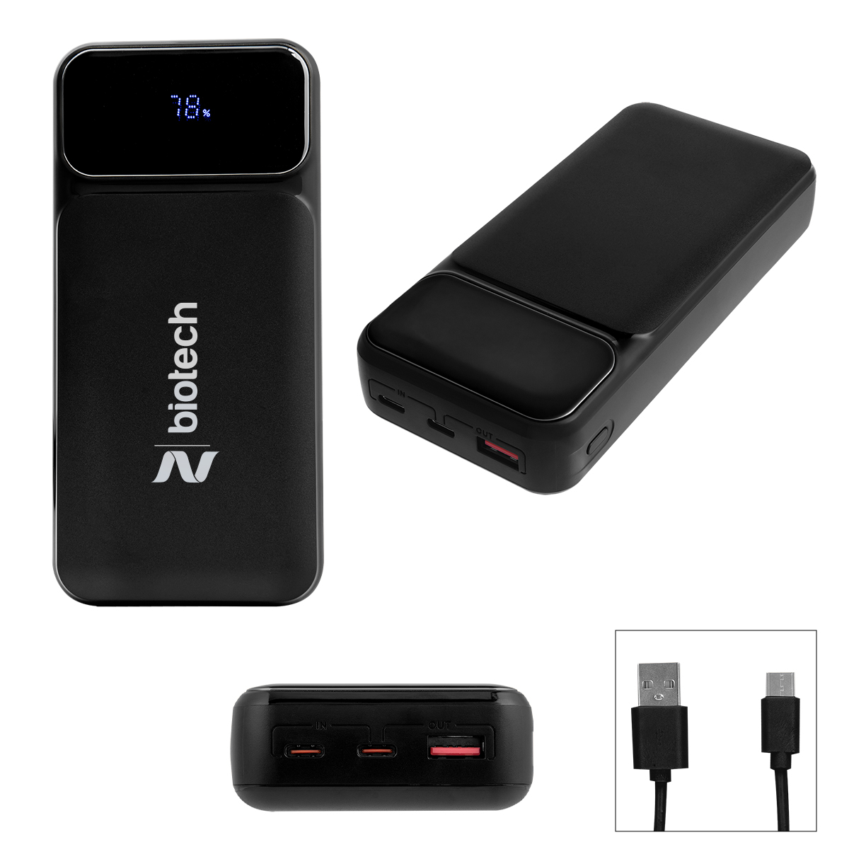 20,000 mAh lithium ion battery powers laptops, tablets, and phones for work and travel