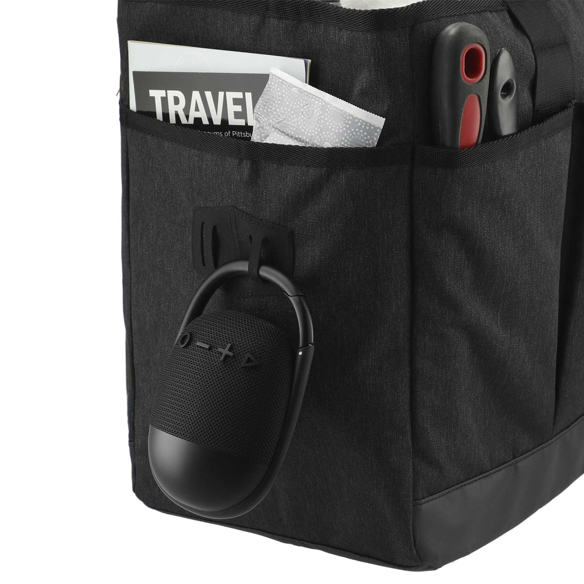 Integrated clip secures the speaker to bags, backpacks, or other gear for portable listening